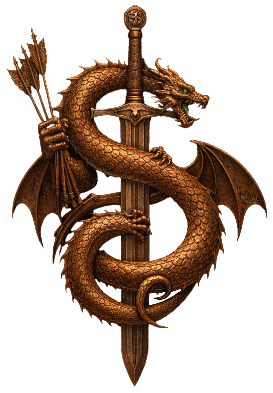 A red wax seal with an embossed crest design of a bronze-colored dragon,  wrapped around a sword, holding a bundle of arrows in its claws and has emerald green eyes.